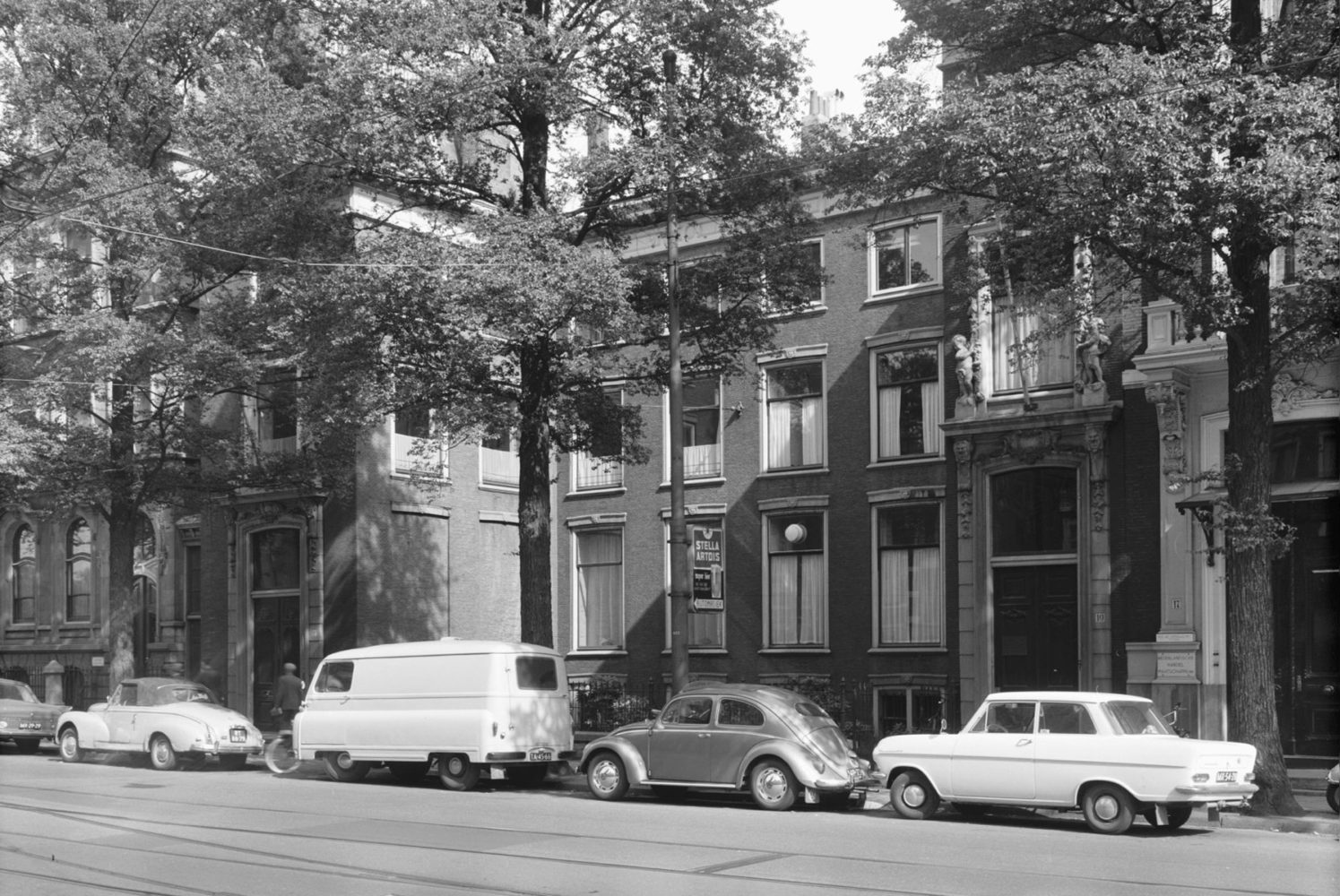 Links een oude zwart-wit foto van een van de monumentale panden aan de Herengracht in Den Haag, vergeleken met het pand tegenwoordig.