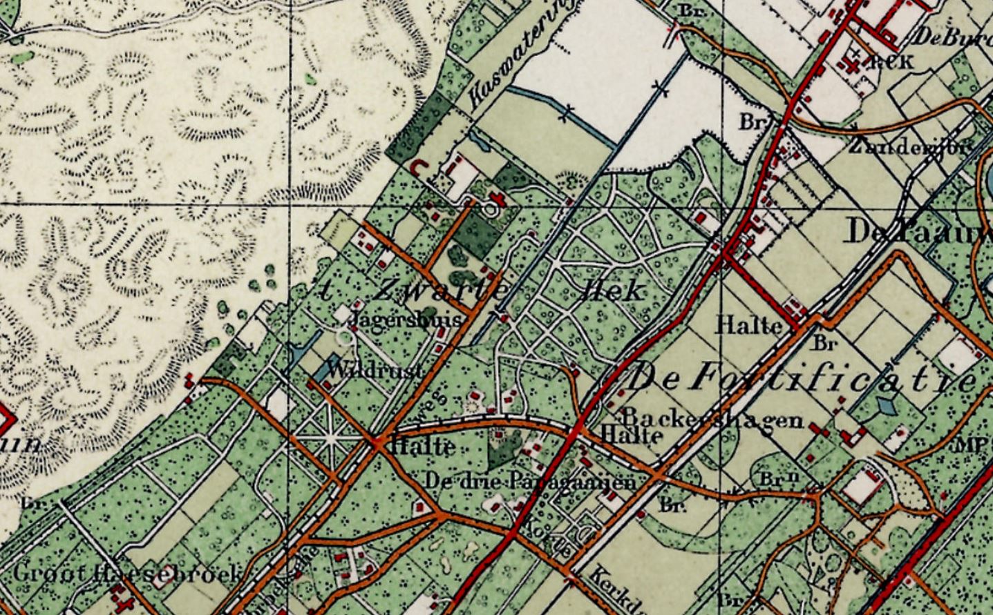 Afbeelding hierboven: topografische kaart uit 1929 met buitenplaats Wildrust