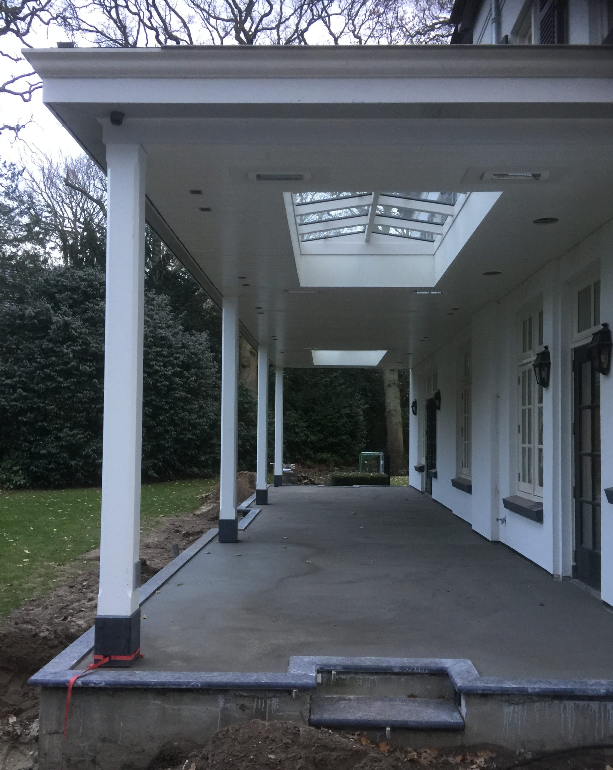 Een centrale ingreep in het ontwerp was het toevoegen van een serre aan de achterzijde van het huis. Deze uitbreiding is zorgvuldig afgestemd op de architectonische taal van het bestaande pand, zodat het niet als storend element wordt ervaren, maar als een natuurlijke voortzetting van het huis. De serre vergroot het wooncomfort en draagt bij aan een betere relatie tussen interieur en tuin, zonder afbreuk te doen aan de historische uitstraling.