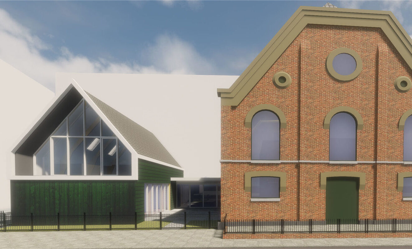 Op de historische afbeelding van de Vermaning hieronder ziet u de oude kosterswoning. Op de afbeelding rechts ziet u het ontwerp van de uitbreiding van de Vermaning, waarvoor de kosterswoning de inspiratie is geweest.