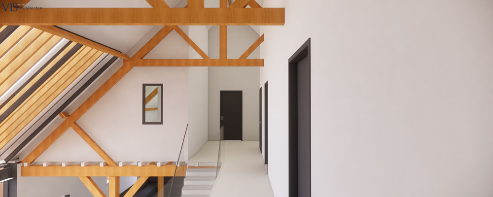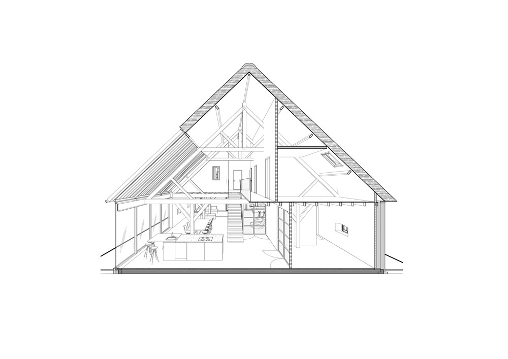 VIS Architecten ontwierp twee woningen binnen het bestaande volume. De eerste woning bevindt zich in het voorhuis, met behoud van kenmerkende elementen zoals de opkamer, kelder en grote vensters. De tweede woning beslaat het achterhuis, waarin de voormalige stalstructuur met kleine stalramen en de oude mest- en staldeuren grotendeels intact blijft. Een glazen pui in de zijgevel en een vide zorgen voor voldoende daglicht in deze woning.