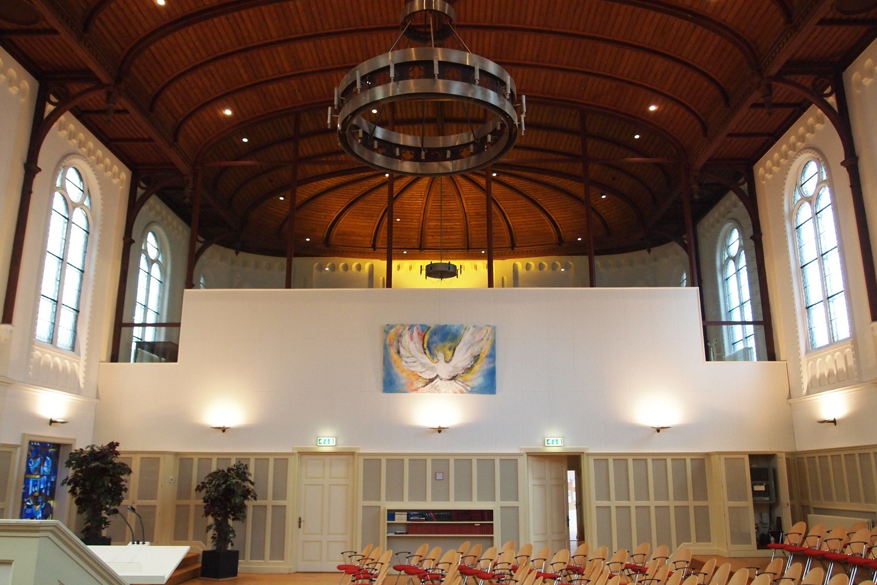 De kerkzaal kreeg een houten vloer en verhoogde zijkanten om een intiemere setting te creëren. De preekstoel werd verplaatsbaar gemaakt, en de opstelling van stoelen kan flexibel worden aangepast. Hierdoor is de kerkzaal nu geschikt voor een breed scala aan gebruik, van kerkdiensten tot culturele evenementen. De koffieruimte bleef behouden en geïntegreerd in het ontwerp, en op functioneel vlak zijn een lift, toiletten, keuken en ontvangstruimte toegevoegd, zonder afbreuk te doen aan het monumentale karakter.