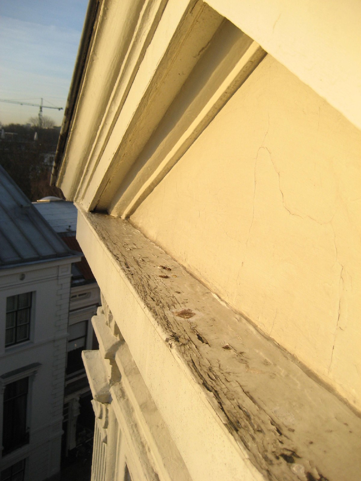 Gedurende eerdere onderhoudscycli waren de gevels meerdere malen overschilderd, wat leidde tot het dichtslibben van ornamenten en verlies van detaillering. In 2012 werd het noodzakelijk om het houtwerk en de gepleisterde gevelelementen volledig te ontdoen van alle verflagen. Deze ingreep bood de mogelijkheid om de oorspronkelijke ornamentale rijkdom van de gevel weer zichtbaar te maken en te herstellen.