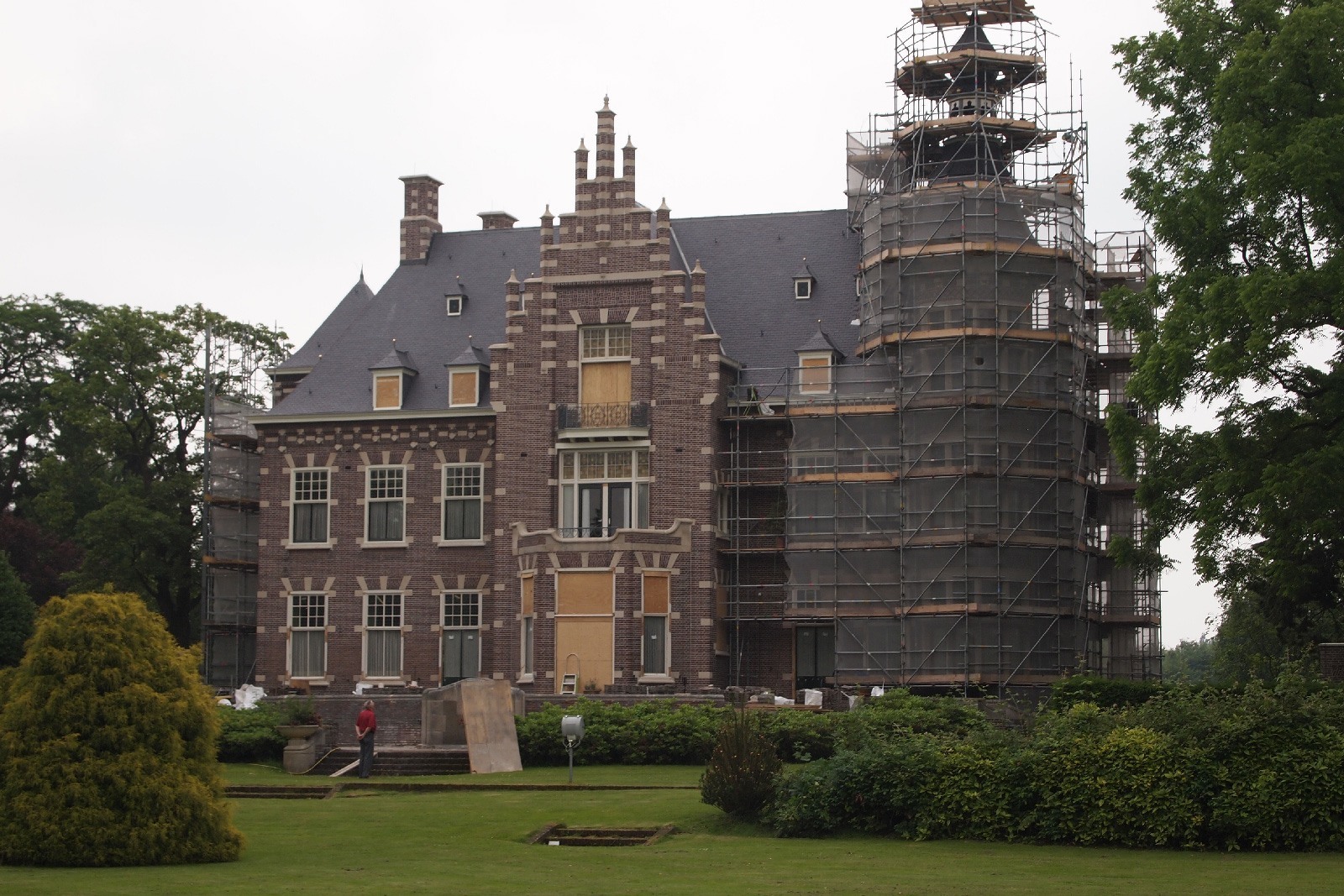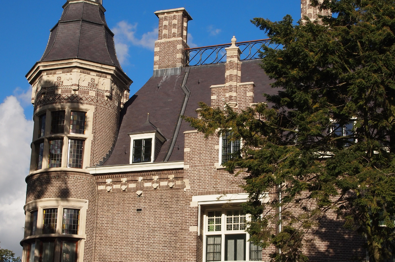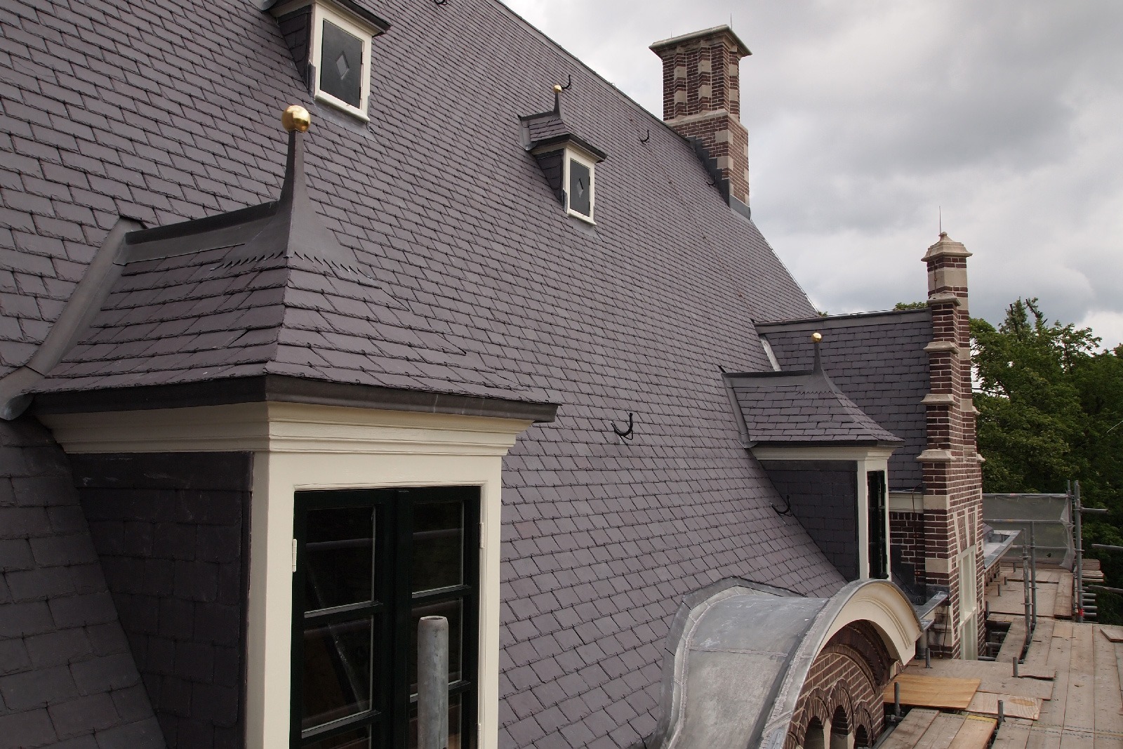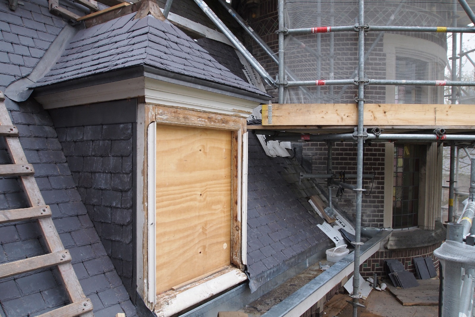 De karakteristieke glas-in-loodramen kregen speciale aandacht: bestaande vensters werden gerestaureerd, nieuwe ruiten vervaardigd voor de stiltekamer boven de entree, en de verouderde voorzetbeglazing werd vervangen door achterzetbeglazing om zowel het monumentale karakter als het thermisch comfort te verbeteren. Het restauratieplan voorzag ook in een grondige aanpak van het dak. Het gehele leiendak, inclusief lood- en zinkwerk, werd vernieuwd. De toren, inclusief het houten ui-vormige dakdeel, werd gerestaureerd, aangetast hout vervangen, en de windvaan met vergulde bekroning werd in ere hersteld. Ook het terras werd aangepakt: de betontegels zijn vervangen door natuursteen, gelegd in een historisch patroon van banden en vierkanten.