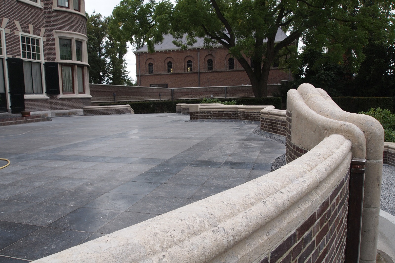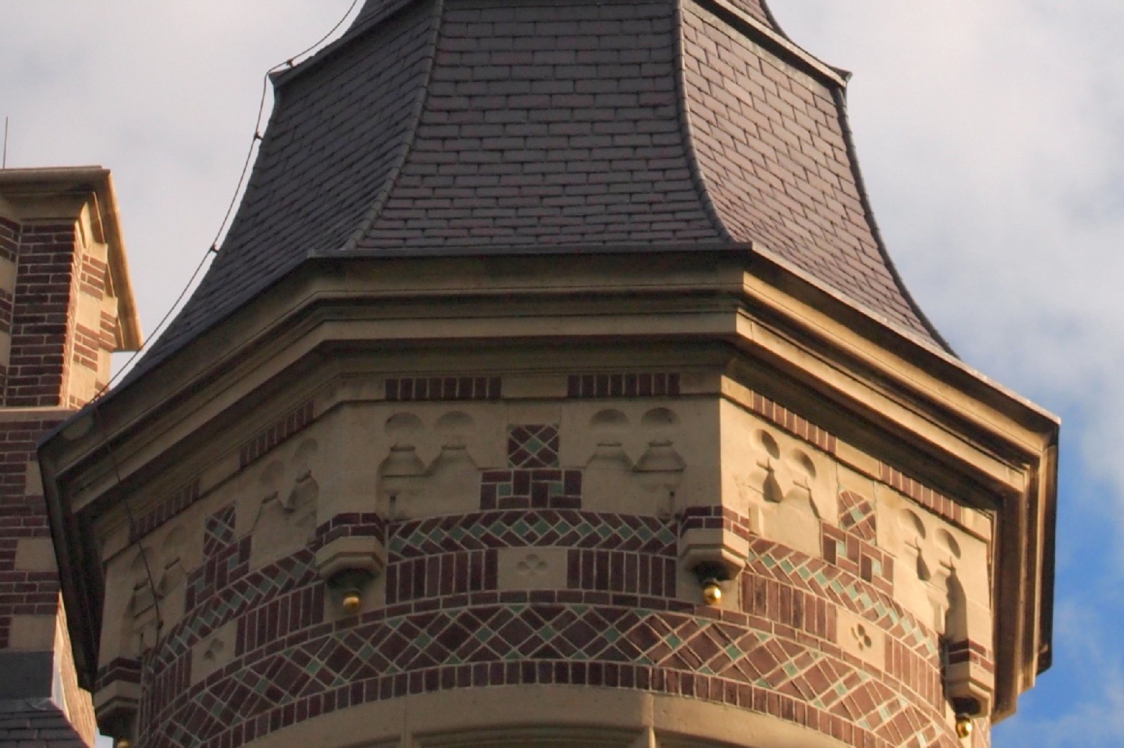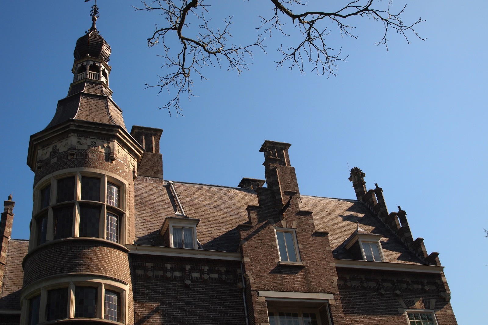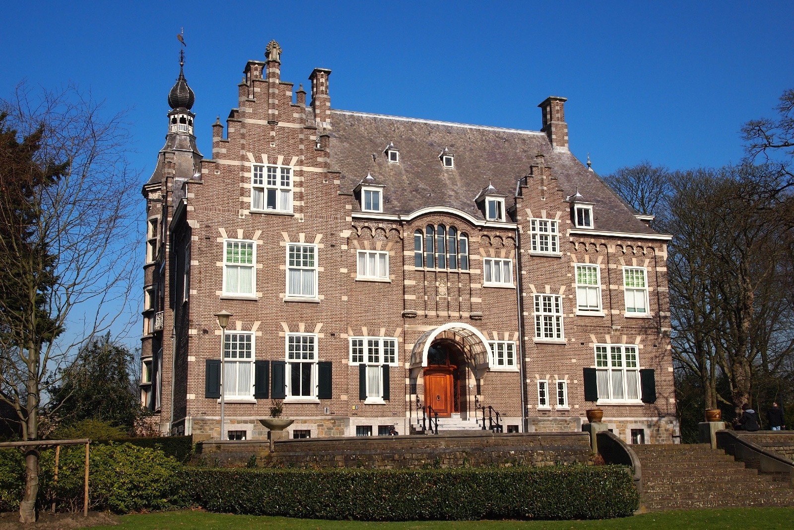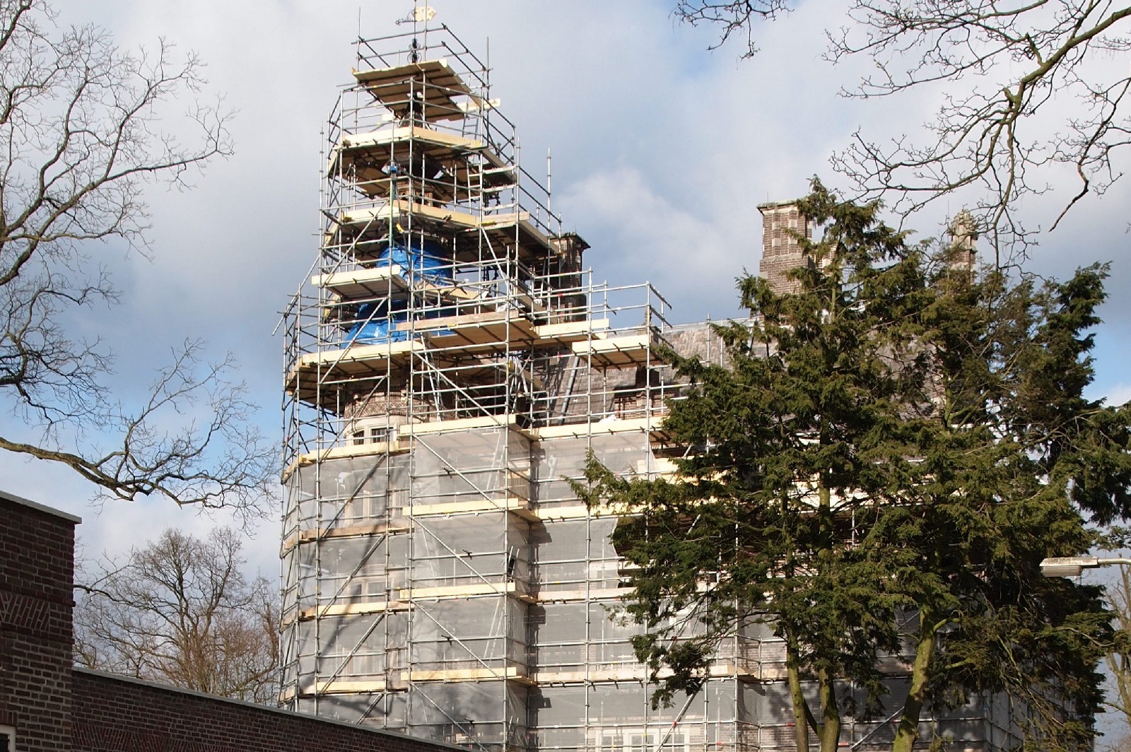 De karakteristieke glas-in-loodramen kregen speciale aandacht: bestaande vensters werden gerestaureerd, nieuwe ruiten vervaardigd voor de stiltekamer boven de entree, en de verouderde voorzetbeglazing werd vervangen door achterzetbeglazing om zowel het monumentale karakter als het thermisch comfort te verbeteren. Het restauratieplan voorzag ook in een grondige aanpak van het dak. Het gehele leiendak, inclusief lood- en zinkwerk, werd vernieuwd. De toren, inclusief het houten ui-vormige dakdeel, werd gerestaureerd, aangetast hout vervangen, en de windvaan met vergulde bekroning werd in ere hersteld. Ook het terras werd aangepakt: de betontegels zijn vervangen door natuursteen, gelegd in een historisch patroon van banden en vierkanten.