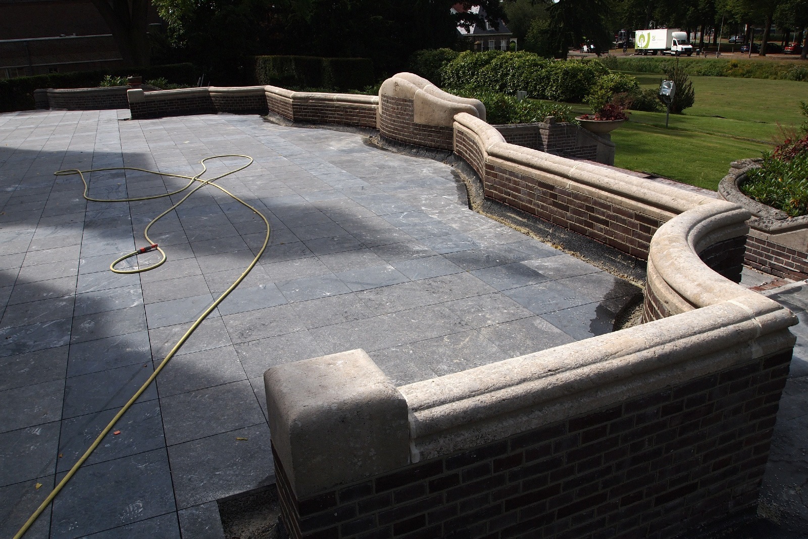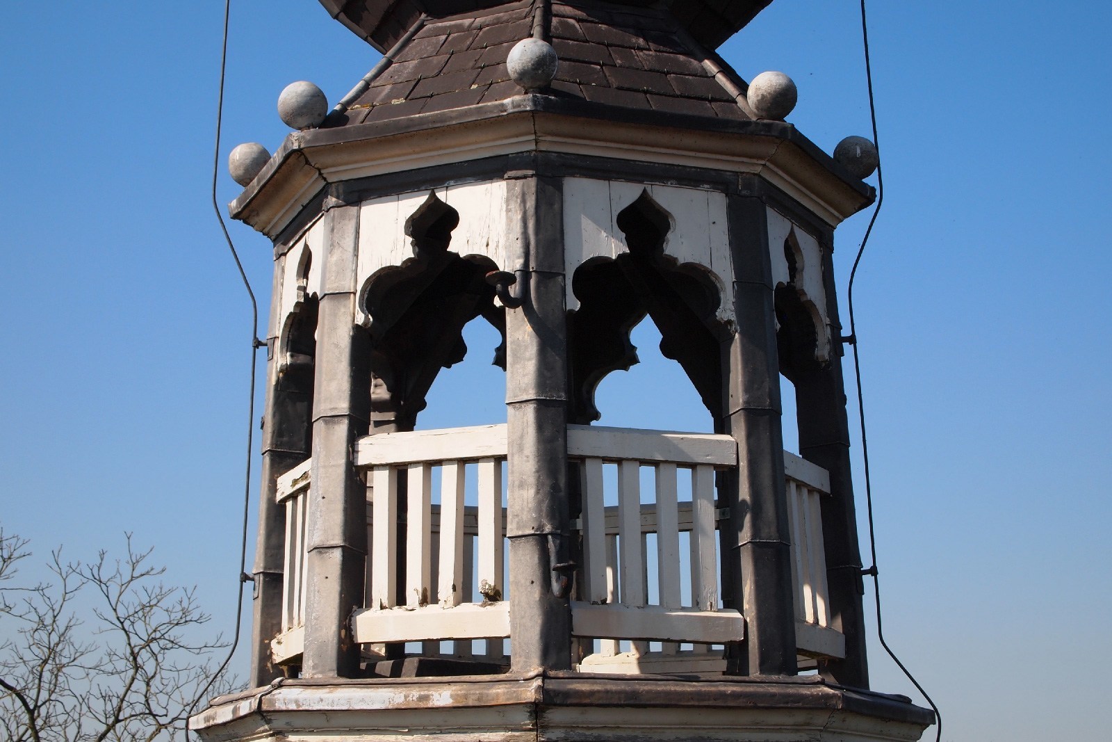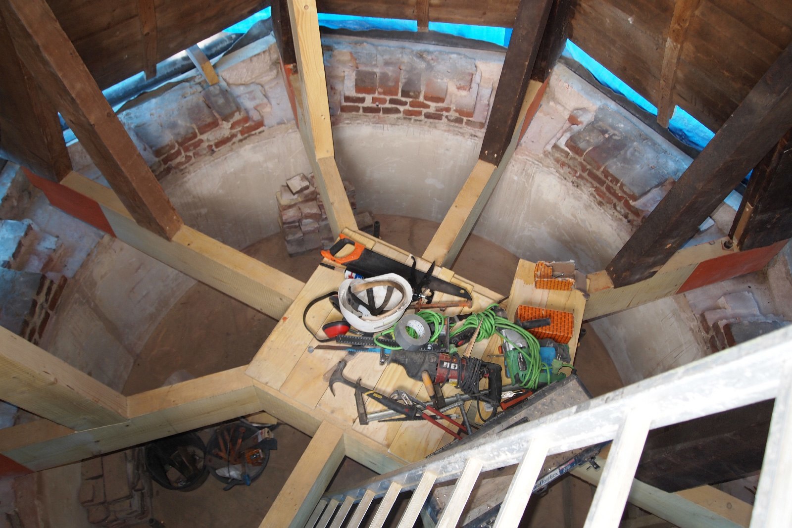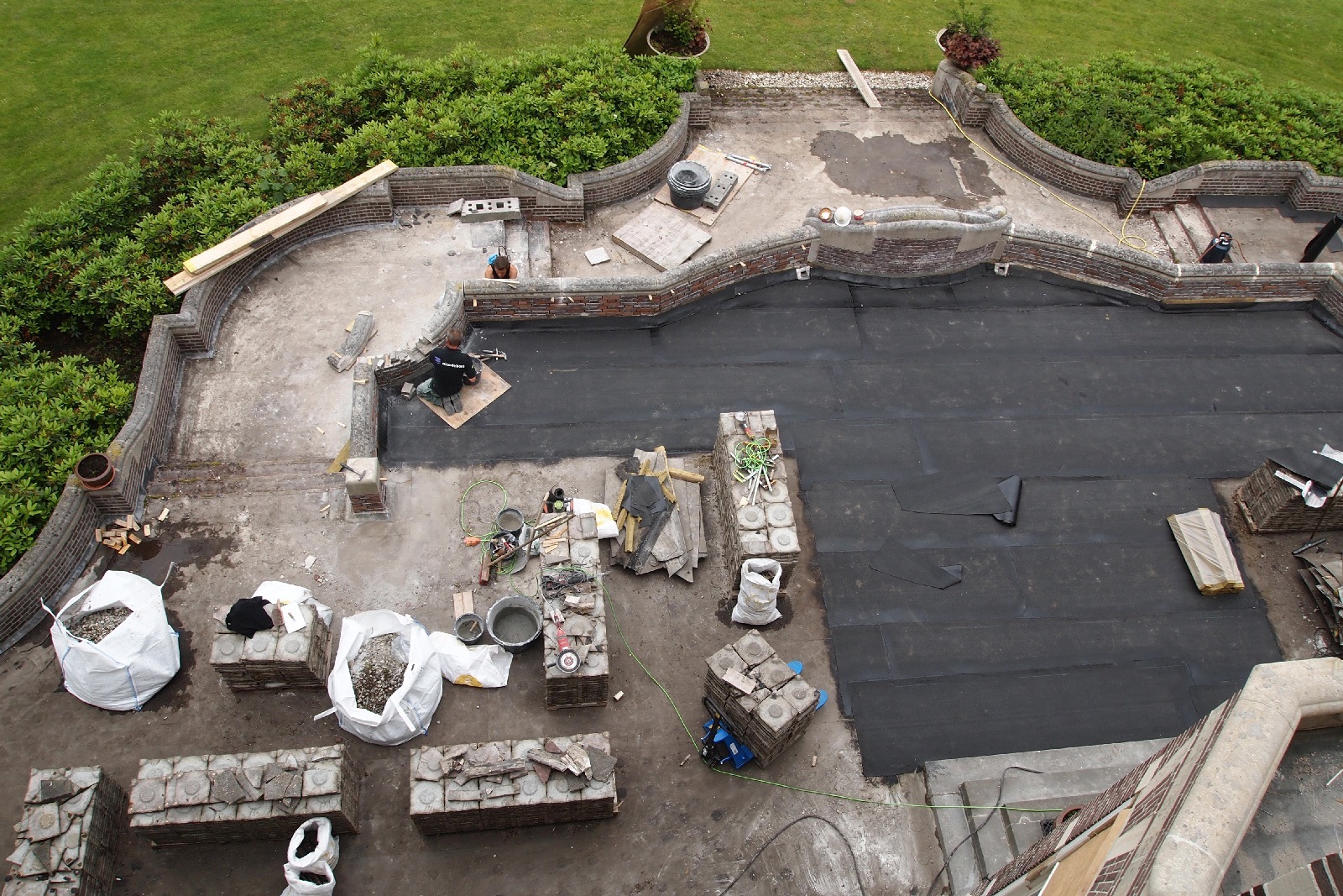 De karakteristieke glas-in-loodramen kregen speciale aandacht: bestaande vensters werden gerestaureerd, nieuwe ruiten vervaardigd voor de stiltekamer boven de entree, en de verouderde voorzetbeglazing werd vervangen door achterzetbeglazing om zowel het monumentale karakter als het thermisch comfort te verbeteren. Het restauratieplan voorzag ook in een grondige aanpak van het dak. Het gehele leiendak, inclusief lood- en zinkwerk, werd vernieuwd. De toren, inclusief het houten ui-vormige dakdeel, werd gerestaureerd, aangetast hout vervangen, en de windvaan met vergulde bekroning werd in ere hersteld. Ook het terras werd aangepakt: de betontegels zijn vervangen door natuursteen, gelegd in een historisch patroon van banden en vierkanten.